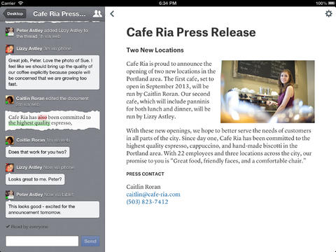 Hvert dokument er udstyret med et chatvindue, hvor du kan kommunikere med de andre brugere og hele tiden kan følge med i de ændringer, der bliver lavet i dokumentet. Og bliver der lavet ændringer i dokumentet på et tidspunkt, hvor du ikke har det åbent, kan du få push-notifikationer om det på din telefon eller tablet.