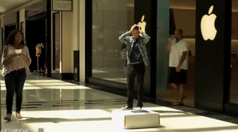 Det gør han ganske tit i nedenstående video, hvor han er forbi en rulletrappe, et gadekryds og ude foran en Apple Store.
