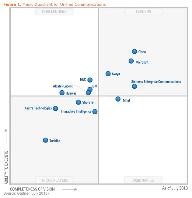 Skal man tro Gartner, er det Cisco og Microsoft, der ligger bedst placeret som markedsledere, mens også Avaya og Siemens er placeret i dette felt.