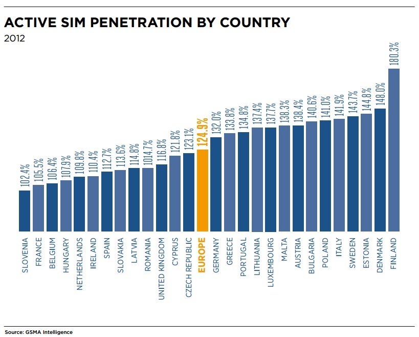 "Ved udgangen af 2012 har Europa tæt på 400 millioner unikke mobilabonnenter (hvilket vil sige mennesker), der aktivt bruger 629 millioner mobilforbindelser (hvilket vil sige SIM-kort)."