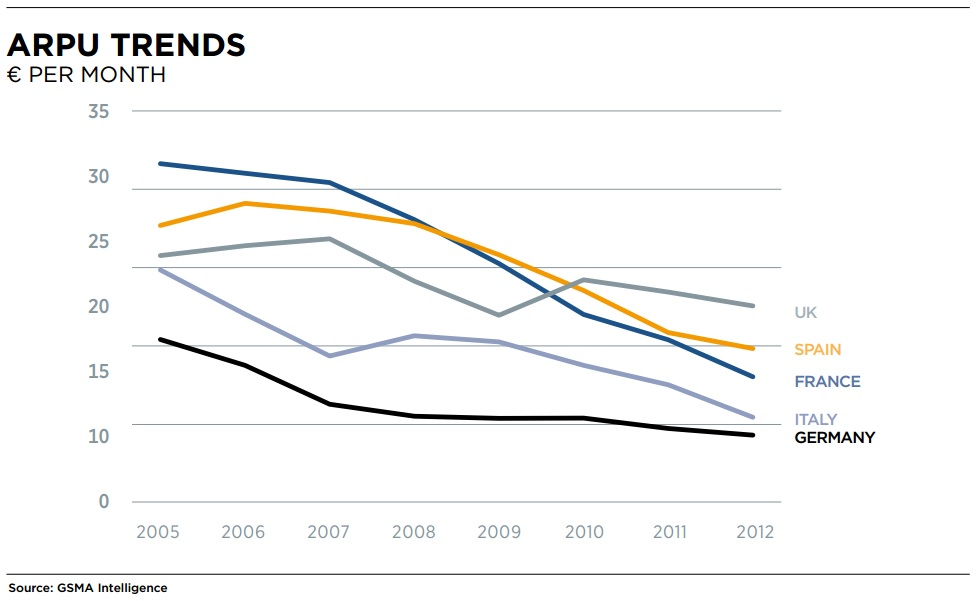 Mens de faldende priser på mobiltelefoni og data i Europa har haft den positive konsekvens, at flere og flere mennesker har fået mulighed for at anvende disse teknologier, har konsekvensen for teleselskaberne været, at den såkaldte ARPU (average revenue per user) er faldet med fem til seks procent om året over de seneste seks år.