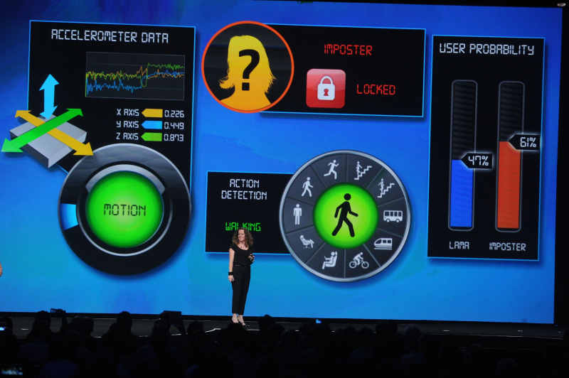 På scenen gik forskeren Lama Nachman rundt med en smartphone, der registrerede hendes gang ved hjælp af det indbyggede accelerometer og gyroskop. Resultatet blev vist på en storskærm for hele salen.
