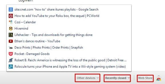 Så har du brug for en liste af de senest lukkede faneblade, og det er lige nøjagtigt, hvad Chrome leverer: Når du nu i forvejen er nede i højre hjørne, så tag et kig på valgmuligheden umiddelbart til højre for Andre enheder: Menuen Senest lukkede. Klik på den og du vil få vist en liste af de 10 senest lukkede faneblade.