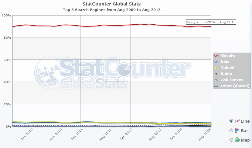 At Google er helt og aldeles urørlig på visse områder, ses blandt andet i denne figur over søgemaskinernes markedsandele over de seneste fire år.