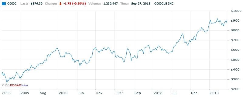 Og se dette billede af Google-aktien på Nasdaq-børsen over de seneste fem år: