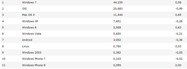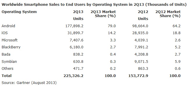 Ifølge Gartner ligger Android på 79 procent, iOS på 14 procent og Windows Phone 3,3 procent efter andet kvartal i 2013.