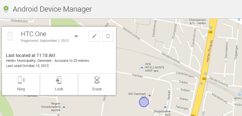 Klik dig ind på Android Device Manager (eller Android Enhedsadministrator), og du får mobilens placering vist på Google Maps.