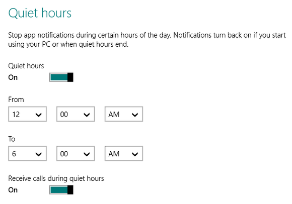 Den er dog også begravet dybt. Åbn Indstillinger og gå ind i Skift pc-indstillinger > Søg og apps > Meddelelser. Rul ned ad siden, indtil du finder Stilletimer. Som standard er Windows 8.1 indstillet til at være stille fra midnat til seks om morgenen, men det kan du ændre til en hvilken som helst anden periode af døgnet.