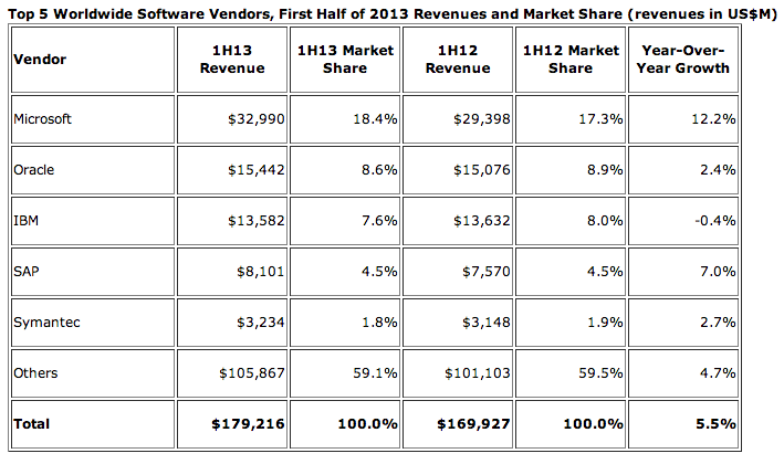 IDC skriver samtidig, at Microsoft har styrket sin position som verdens største software-leverandør og i første halvår 2013 havde en markedsandel på 18,4 procent målt på omsætning.