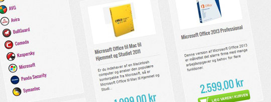 Webbutikken sælger for eksempel lige nu Microsofts professionelle Office-pakke til 2.599 kroner. Det er 1.400 kroner under prisen i Microsofts egen webbutik. Lige så gode er priserne på en række antivirus-produkter fra Symantec, F-secure og AVG.