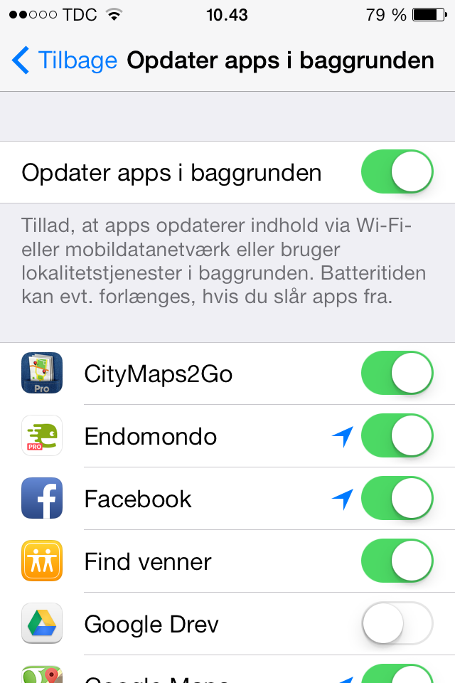Gå også ind under Indstillinger, Generelt og Opdater app i baggrunden. Du skal være opmærksom på, at det ikke altid er smart at slå dette fra - eksempelvis ønsker du måske, at Facebook og Endomondo rent faktisk skal opdatere i baggrunden.