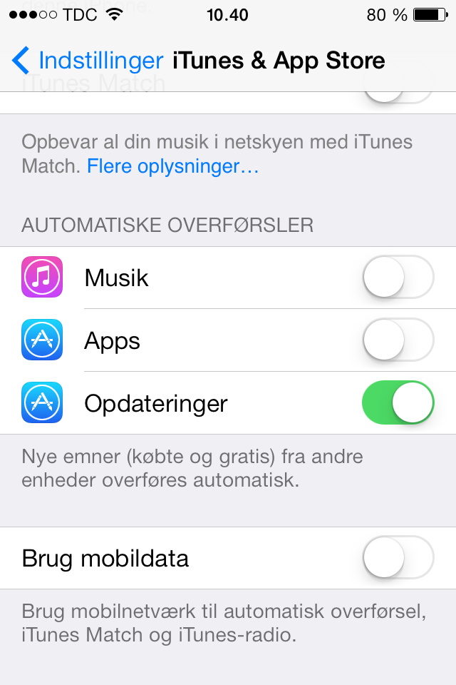 Du kan også lukke for auto-opdateringer af apps, så du i stedet skal opdatere til nye versioner manuelt. Gå ind under Indstillinger, iTunes & App Store og slå Automatiske overførsler fra.