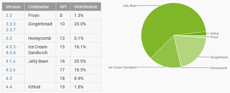Den nyeste version af Android, KitKat, er endnu kun at finde på 1,8 procent af de Android-telefoner, der indgår i statistikken - det skyldes dog først og fremmest, at KitKat først blev frigivet til de første produkter i november sidste år.