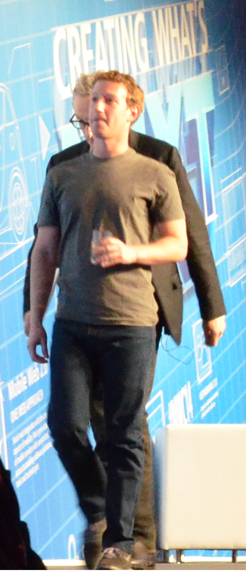 Facebook-direktøren var iført en simpel t-shirt, mørke jeans og gummisko - noget af en kontrast til de mange sorte jakkesæt nede i salen.