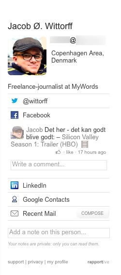 Det er netop også fra LinkedIn, at Rapportive henter en stor del af sine informationer om folk, men der bliver også hentet data ind fra sociale netværk som Twitter og Facebook.