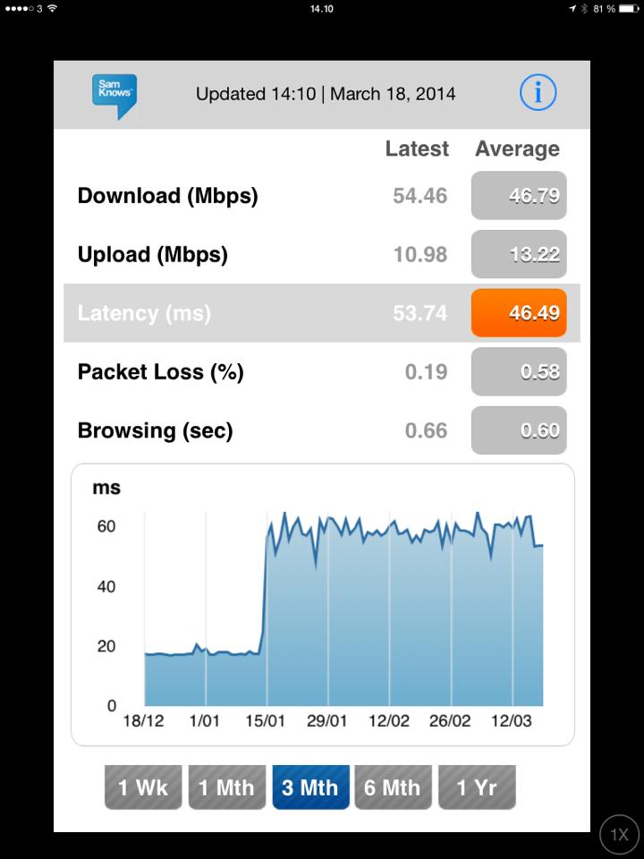 Samtidig dækker en gennemsnitlige ping-tid også over, at den maksimalt målte ping eksploderer.