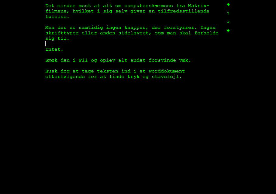 Blandt andet skriveprogrammer som Dark Room. Det lille program minder mest af alt om skærmteksten fra Schi-fi-filmen Matrix: Sort skærm, grøn tekst. Programmet er gratis, og med et tryk på F11 bliver hele skærmen sort og fjerner alle former for distraktion.