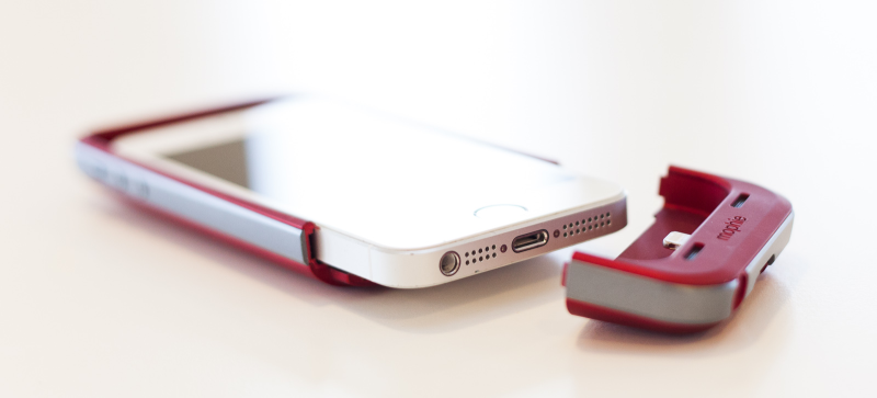 Ud over at fungere som eksternt batteri virker Mophie også som et cover. Der er derfor de sædvanlige udskæringer til kamera og ekstra eksterne knapper til power, volumen samt mute-knappen.