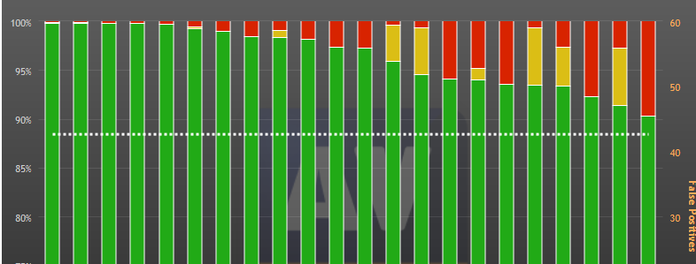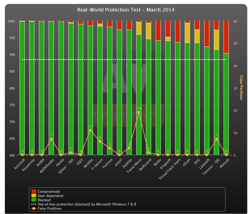 Efter testen har AV-Comparatives vurderet produkterne efter hvor mange, der fejlede med at opdage malware, hvor mange, der var afhængige af, at brugeren foretager noget aktivt og hvor mange falske positiver, det enkelte program kom op med.
