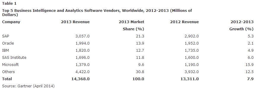 Omsætningen på det globale marked for business intelligence-software steg med otte procent fra 2012 til 2013 til i alt 14,4 milliarder dollar, omkring 80 milliarder kroner.