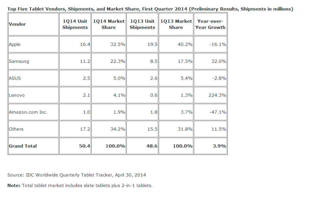Apple holder fast i førertrøjen, selv om salget dalede fra 19,5 millioner enheder i første kvartal 2013 til 16,4 millioner i første kvartal 2014. Apples markedsandel er fortsat høj, nemlig 32,5 procent. Der er dog tale om et lille fald fra det foregående kvartal, da Apple sad på 33,2 procent.