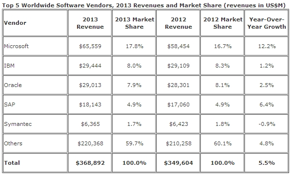 En ny opgørelse fra IDC viser, at Microsofts omsætning på softwaremarkedet fra 2012 til 2013 voksede med 12,2 procent.
