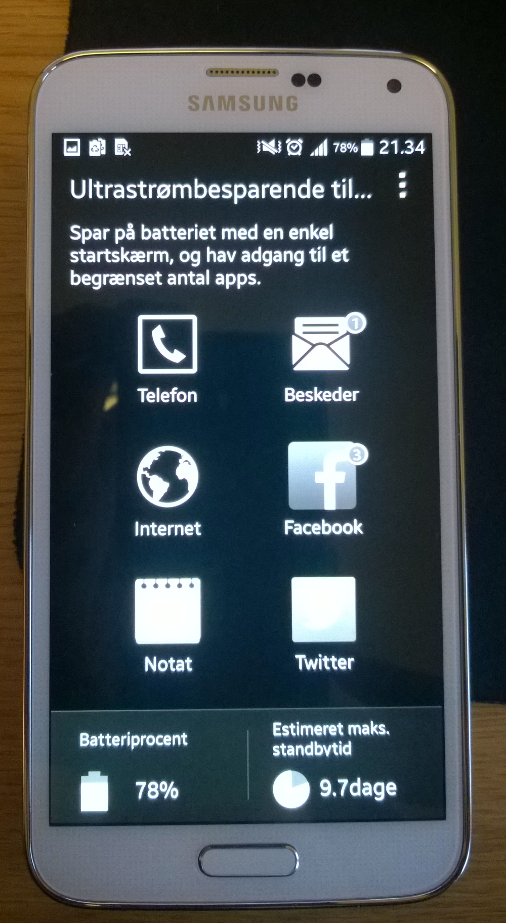 Aktiverer man dette, står man tilbage med en sort/hvid telefon, hvor kun få udvalgte apps kan bruges. Til gengæld skal den efter sigende kunne overleve 10-13 dages stand by-tid. Jeg kunne få min til at have strøm på sig i tre dage - da jeg aktiverede "Ultra Battery Saver" ved 35 procent strøm.