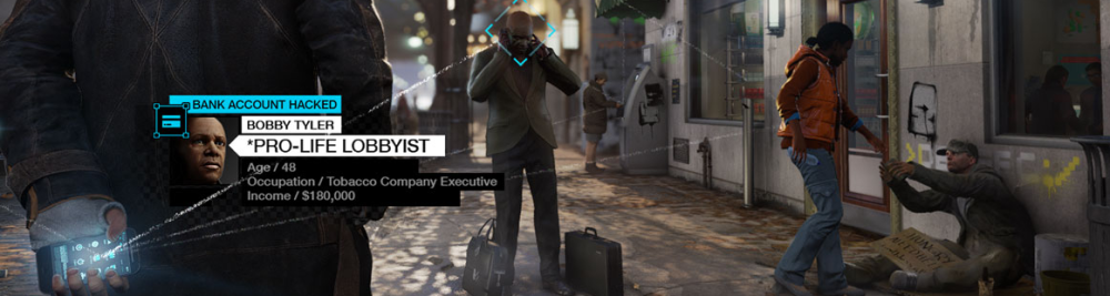 Ved siden af sidder en hjemløs mand, der er hjemvendt fra Irak. Aidens telefon viser, at han lider af posttraumatisk stress, og igen kan Aiden med et enkelt klik hacke også den hjemløses bankkonto, hvor der kun står 310 dollars.