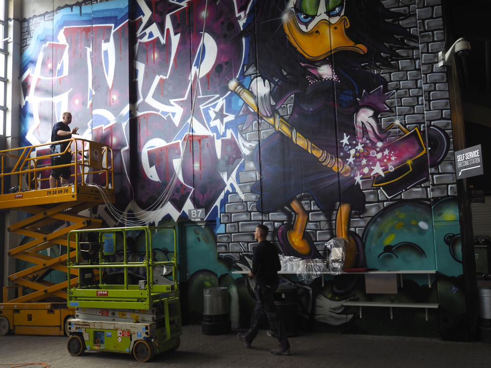 "Alle tribune-installationerne skulle laves fra lift eller stillads, og det er en udfordring, når der er kampe herinde i Parken. Så vi har skullet forhandle os lidt frem til, hvornår vi kunne køre rundt med lifte herinde, men heldigvis havde vi nogle gode folk, der er vant til at arbejde i højden."