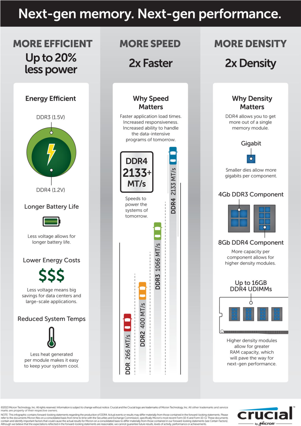 DDR3 kræver generelt 1,5 volt i drift. DDR4 har brug for 20 procent mindre - kun 1,2 volt. DDR4 understøtter også en ny, dyb standby-tilstand, der gør forventes at reducere hukommelsens strømforbrug i standby-tilstand med 40-50 procent.