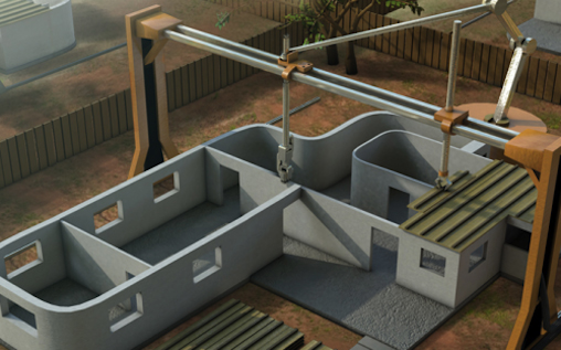 Det tog ifølge ham blot en måned at rejse disse bygninger med printer-teknikken, der modtager ordrer og data fra CAD-software - ganske som 3D-printere i mindre målestok.
