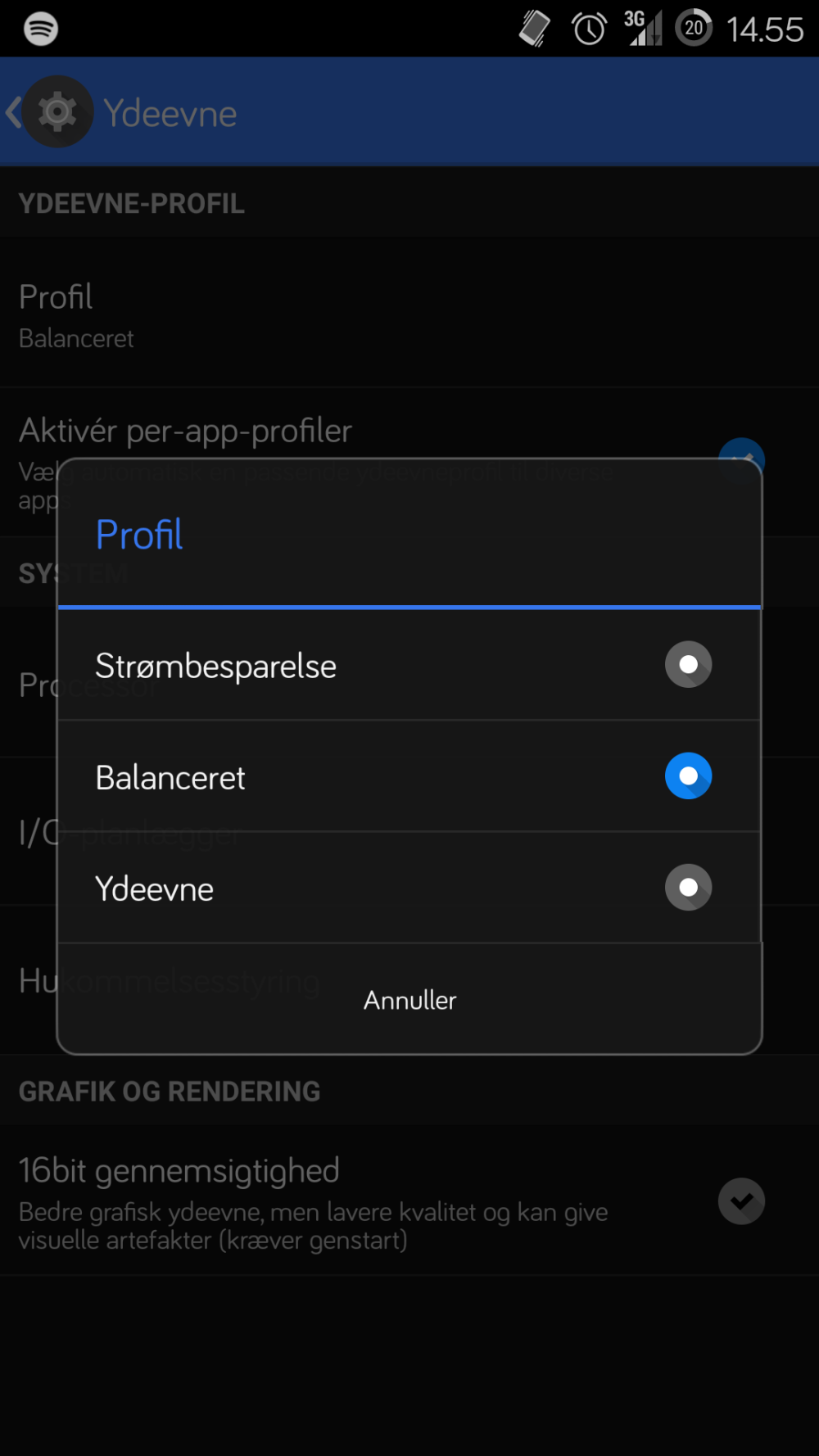 Men er man utilfreds med batterilevetiden, eller vil man gerne have den til at arbejde endnu hurtigere, så længe leve CyanogenMod. I et udvidet og lettere skjult menufelt finder man ydeevnehåndtering. Her er det muligt at ændre telefonen, så den konstant kører på strømbesparende, balanceret eller fuld ydeevne.