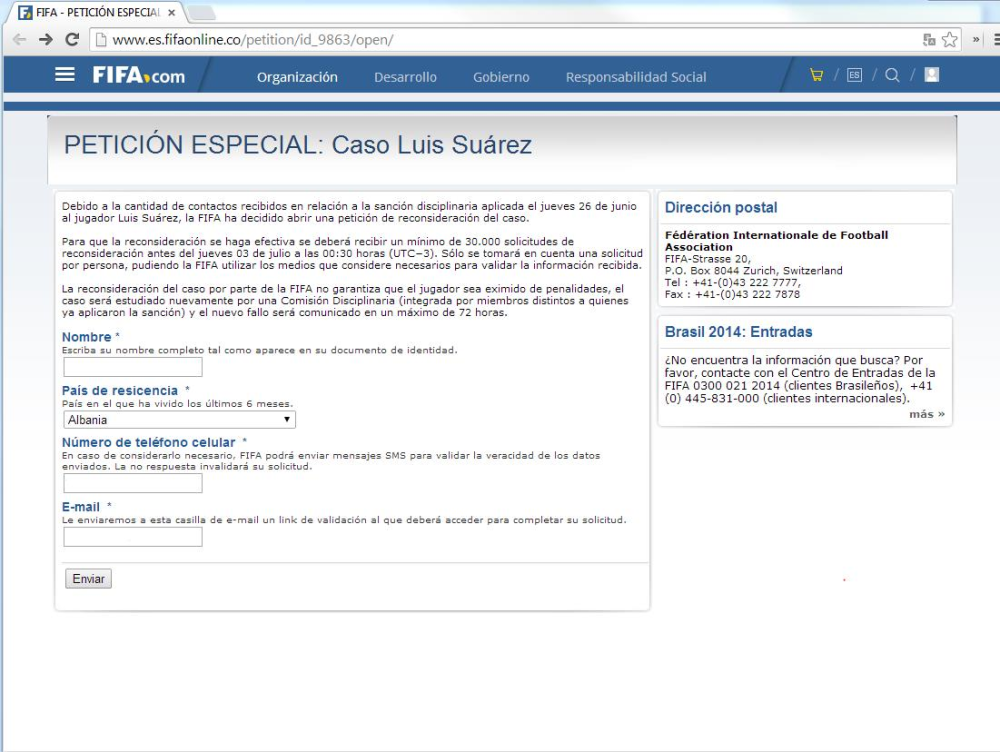 Den falske hjemmeside opfordrer besøgende til at underskrive en støtteerklæring for den kontroversielle uruguayanske fodboldspiller Luis Suarez. Han blev i sidste måned idømt karantæne og udelukkelse fra fodbold, efter at han bed en modstander under Uruguays indledende puljekamp mod Italien ved fodbold-VM i Brasilien.