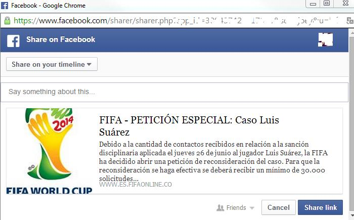 Brugerne, der underskriver den falske erklæring, bliver desuden opfordret til at dele linket til den falske FIFA-side, som på den måde bliver spredt via Facebook og andre sociale medier.