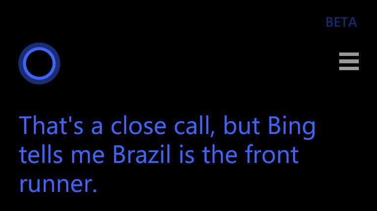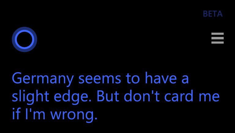 Når det gælder resultatet af den kommende søndags finale mellem Tyskland og Argentina, vælger Cortana en variant af det gamle citat fra den tidligere engelske angriber Gary Lineker, der engang beskrev fodbold, som et spil, der inkluderer en bold og 22 spillere, hvor tyskerne altid vinder til sidst.