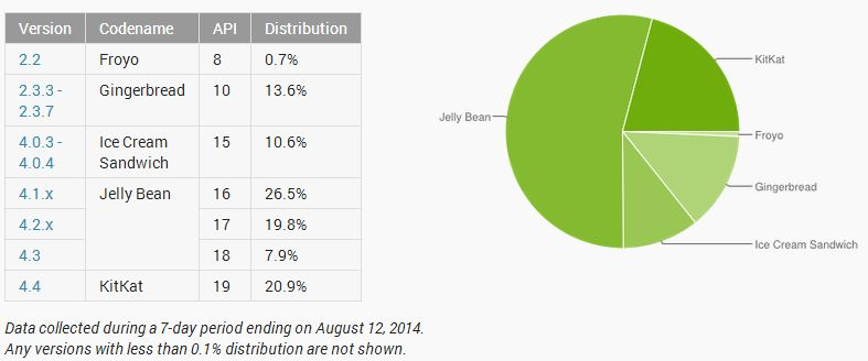 Den seneste månedlige rapport fra Google viser her i august, at 21 procent af alle Androidtelefoner kører Googles nyeste version af Android, KitKat (4.4).