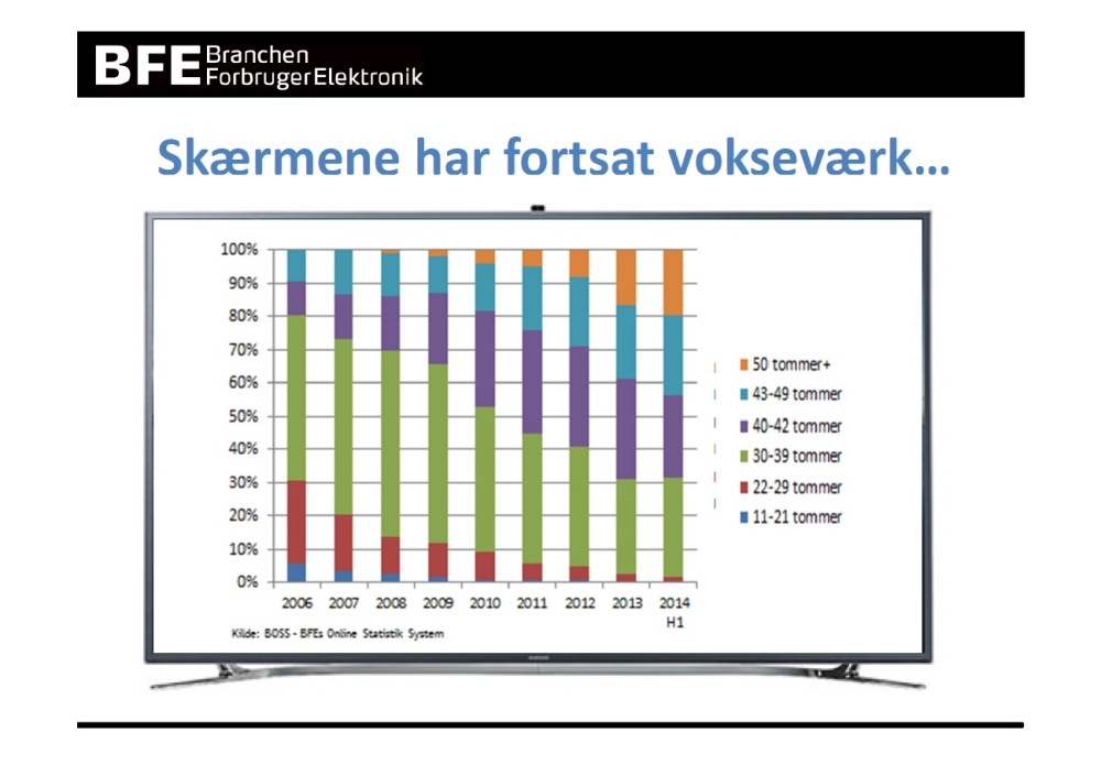 Den seneste opgørelse fra Brancheforeningen for Elektronik, BFE, viser, at for blot fem år siden var omkring to procent af alle solgte fladskærme i Danmark over 50 tommer. Det tal er i første kvartal af 2014 steget til 20 procent.