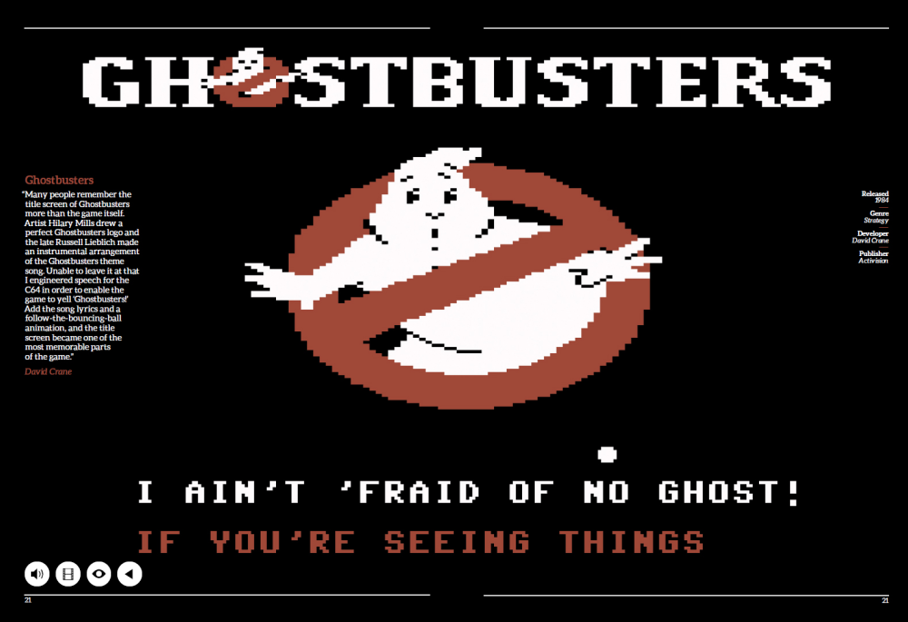 Ghostbusters: Filmen var et kæmpe hit, og spillet var en måde at genopleve biografmørkets oplevelser. Titelskærmen havde en ekstremt digital udgave af Ray Parker Jr. hit, mens selve spillet var en kamp for at komme frem til den episke slutscene - hvilket aldrig lykkedes for undertegnede.