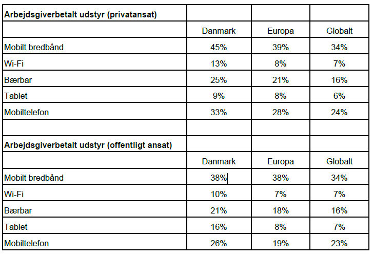 Blandt privatansatte har 33 procent en arbejdsgiverbetalt mobiltelefon og 45 procent får mobilt bredbånd afregnet i firmaet.