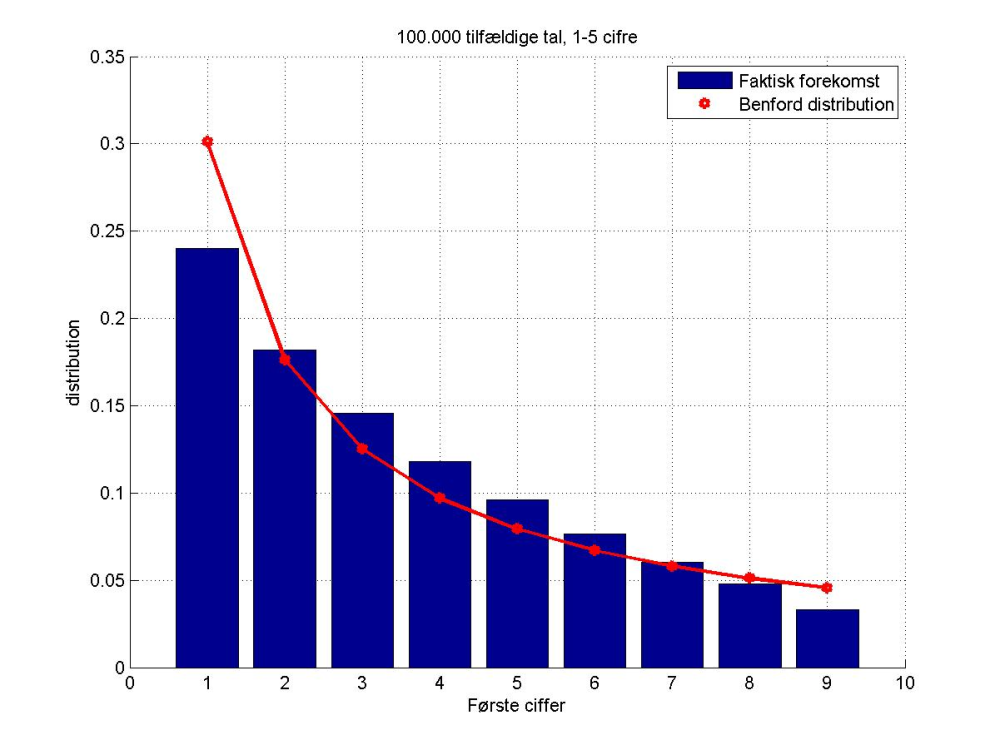 Hvis vi nu øger talrækken til 100.000 elementer mellem 1 og 5 cifre, så rammer vi rimelig tæt på Benford-distributionen.