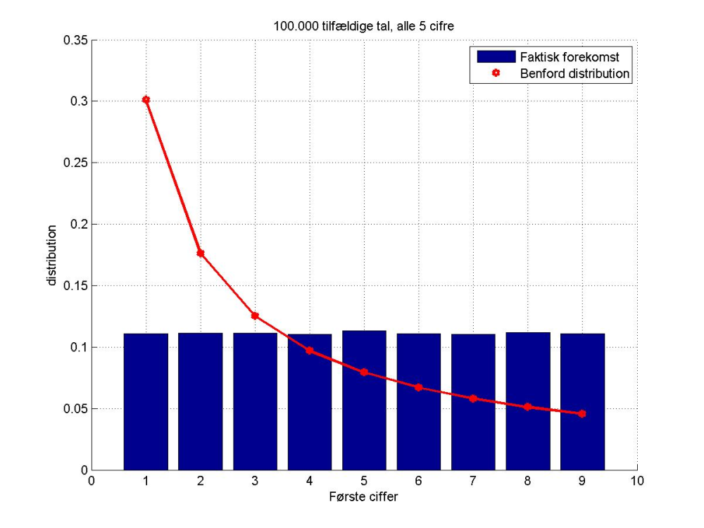 Hvis vi genererer 100.000 tilfældige tal, alle med det samme antal cifre, så bryder vi den anden regel, og de overholder derfor heller ikke Benfords lov.