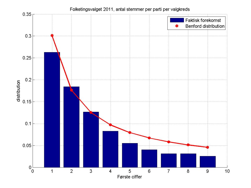 Valgdata giver en næsten perfekt distribution i forhold til Benfords lov, og det kan vi faktisk bruge til at vurdere, om data er manipuleret.