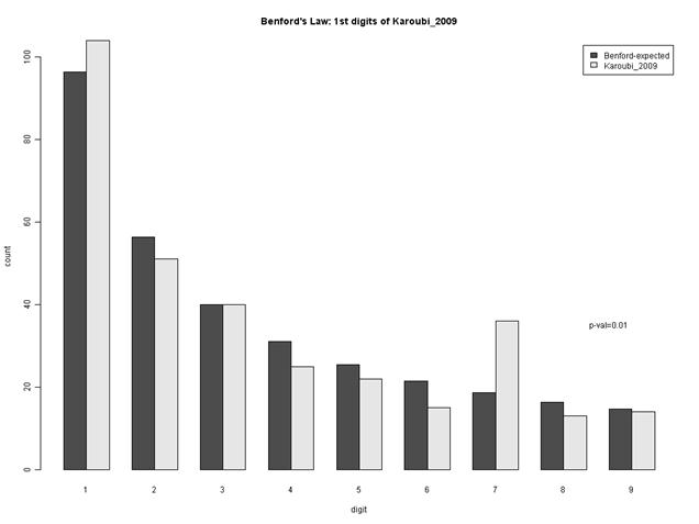 Hvis vi nu tager præsidentvalget i Iran i 2009, hvor der var stor kontrovers og mange beskyldninger om valgsvindel både indenrigs og fra eksterne observatører, og foretager en tilsvarende analyse, viser det en tydelig afvigelse ved tallet 7.