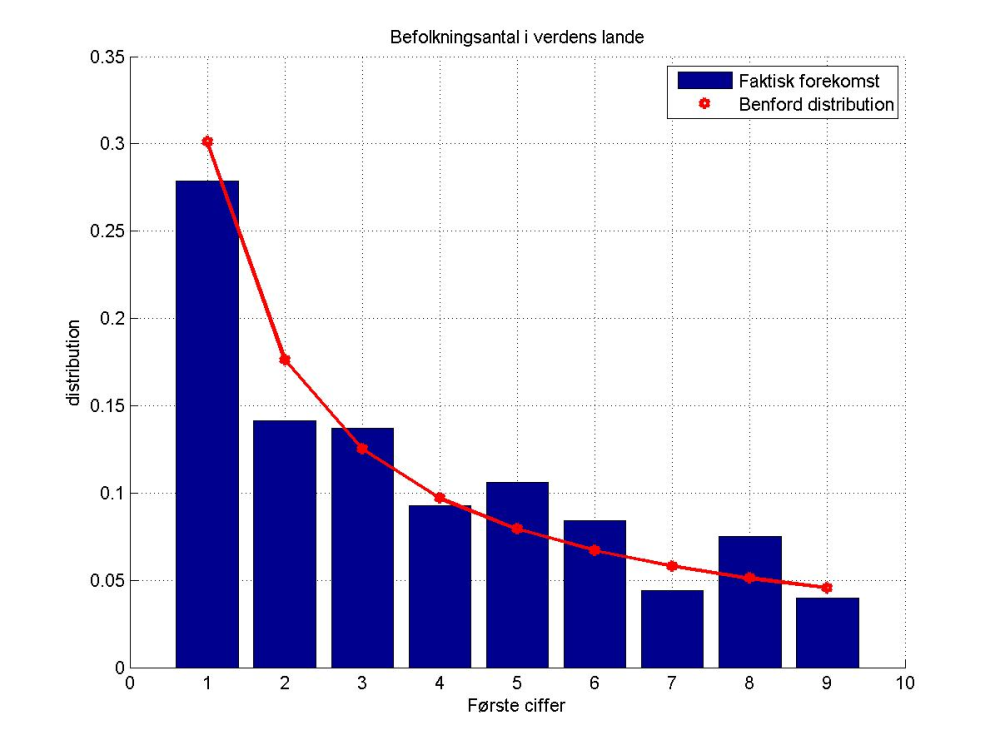 Befolkningen pr. land i verden viser f.eks. en tydelig tendens til at passe på Benford-fordelingen.