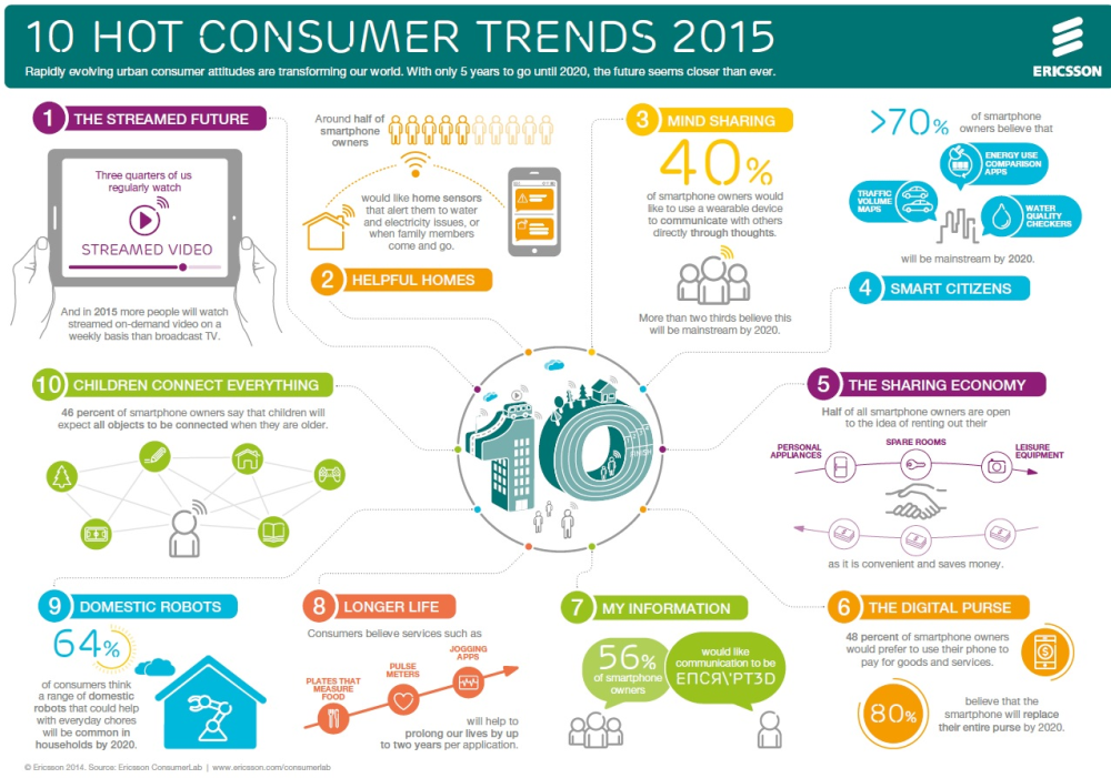 Ericsson ConsumerLab har åbnet for indholdet i telefirmaets årlige trends-rapport, der beskriver de vigtigste forbrugertrends for 2015 og frem til 2020.