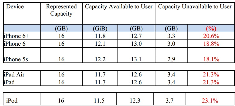 I sagsanlægget er der også en tabel med de konkrete udregninger af forskellen imellem den markedsførte og reelle storage-kapacitet på forskellige Apple-enheder med iOS 8.