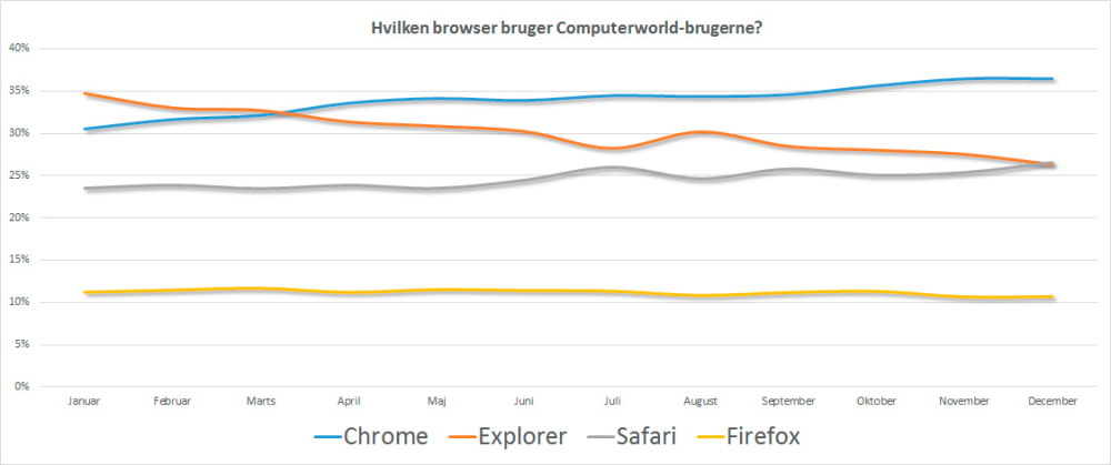 Gode gamle Firefox ligger i øvrigt stablet på Firefox 10,5 procent over næsten hele året. Og hvis du leder efter Opera, så bruger blot 0,6 procent af Computerworlds læsere den.