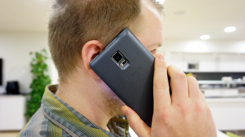 Hvis vi et kort sekund ser bort fra den kurvede skærm, så er det mere eller mindre en Note 4-telefon, som vi sidder med i hånden.