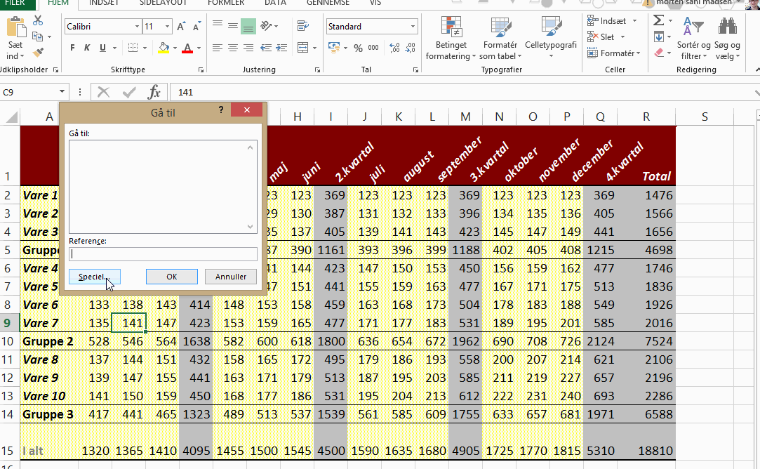 1. Markér alle celler med Formler, Tal eller tekst