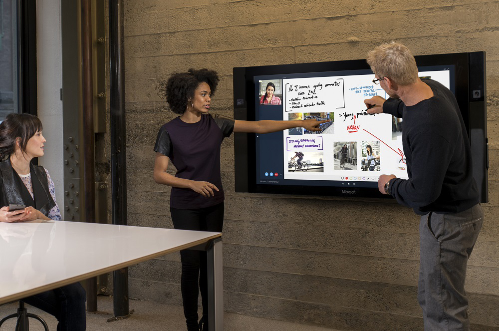 Skærmen kommer efter et opkøb af Perspective Pixel, et firma som lever af at lave store skærme med multitouch, og det så da også imponerende ud på scenen, da de med lethed skrev på tavlen med en stylus, delte det med de andre i et videocall, og trak andre powerpoint-slides, 3D-modeller og tekst ind.